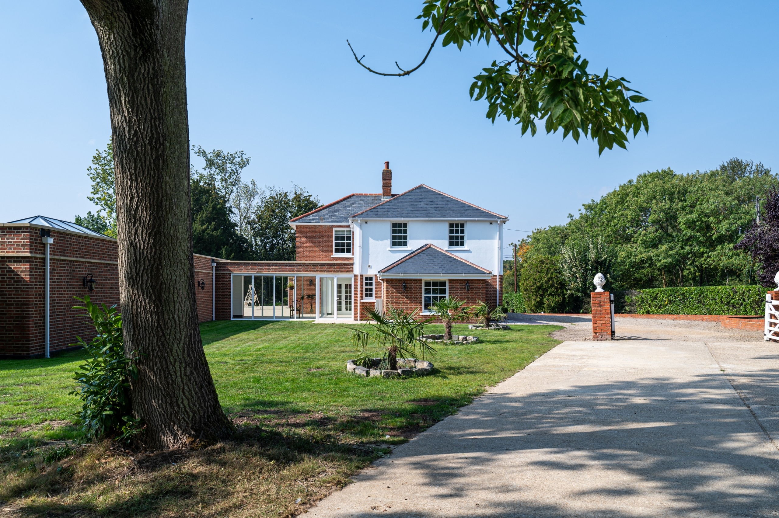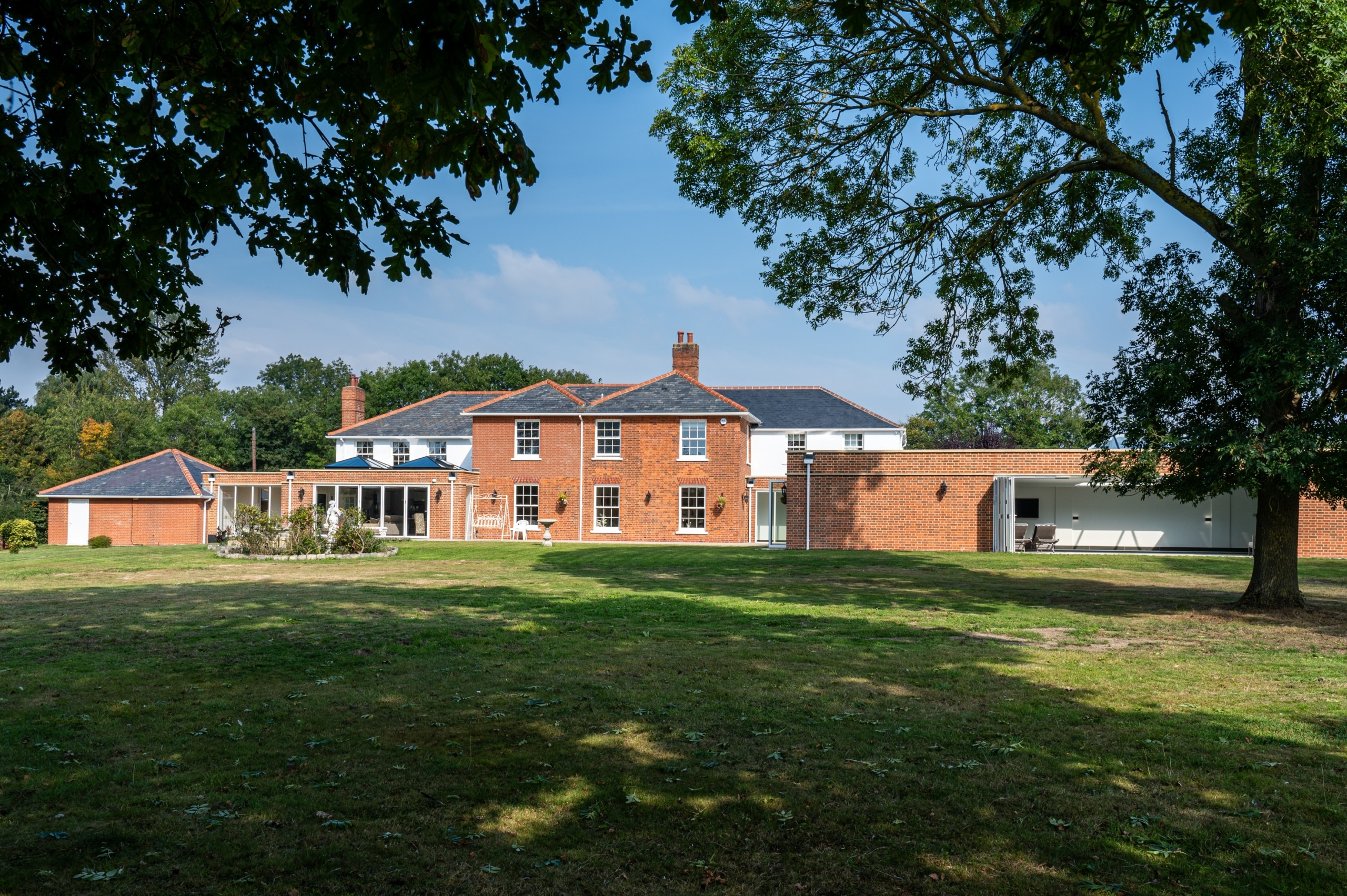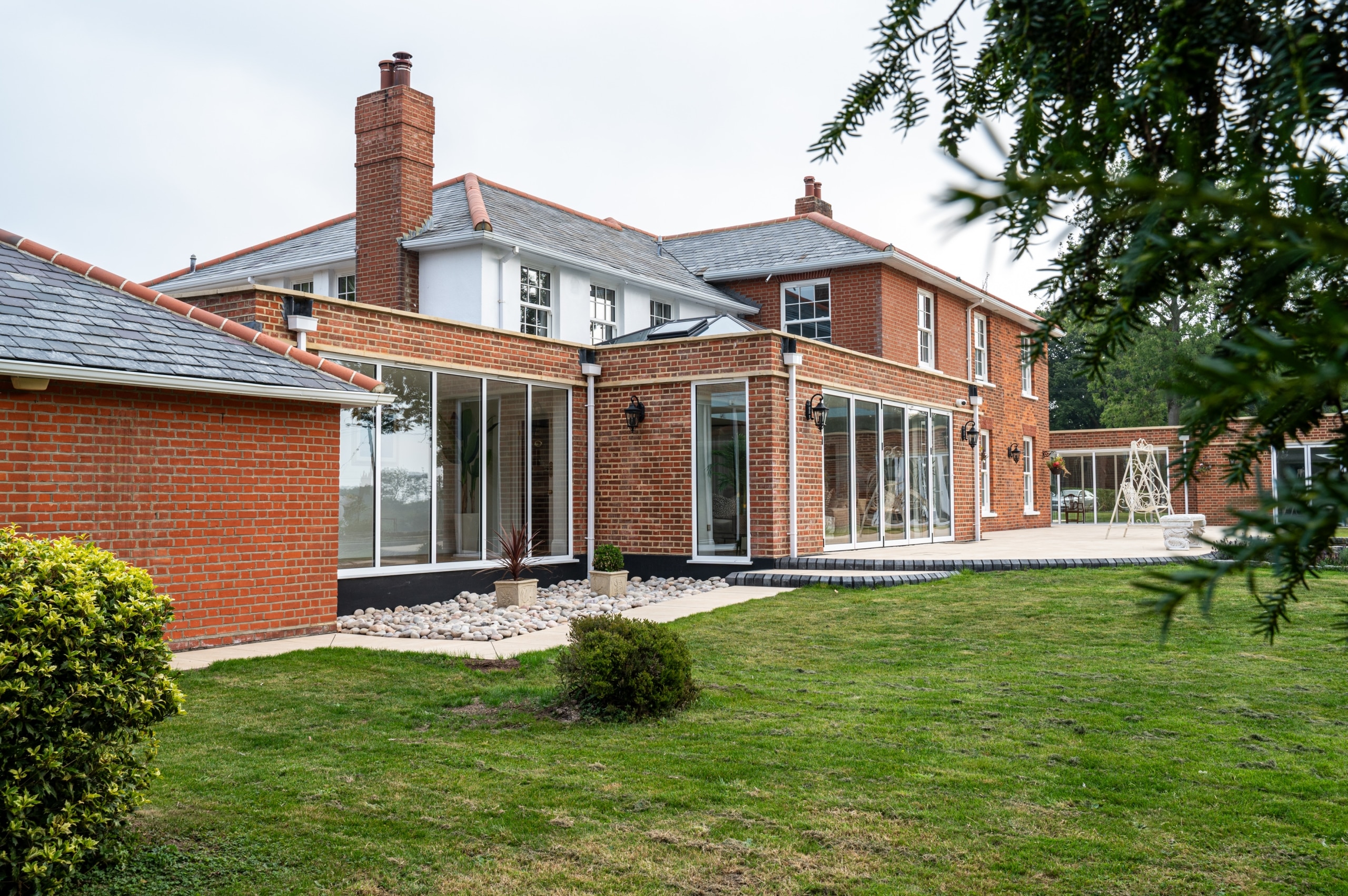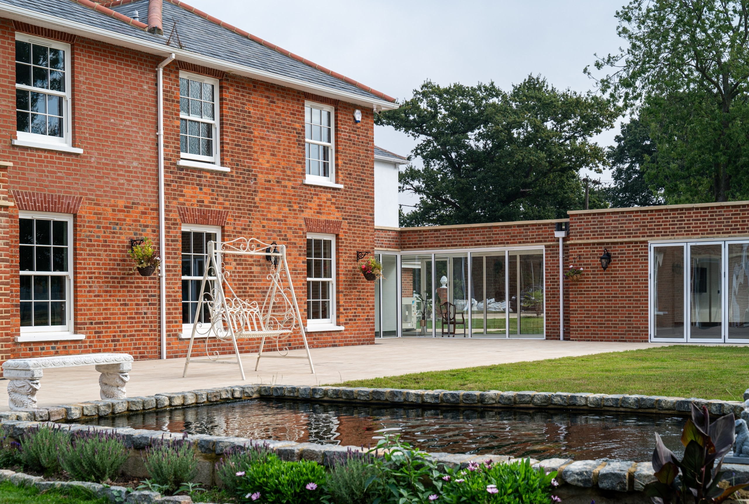 Our client purchased this beautiful detached, Georgian period property with a view to restore it to its former glory. The property was sympathetically renovated throughout, using traditional skirting boards, deep coving and a stunning, galleried, wooden staircase. The old Georgian bar, sliding sash windows were replaced with sympathetic period styled modern glazing with simple white frames and Georgian bar design. The single-storey rear extension gave our clients a huge open-plan, family living space, complete with traditional shaker Kitchen, large island and dining area. The addition of two glass lanterns and bifold doors create a light filled space which makes the most of the beautiful garden views and countryside setting. An indoor swimming pool was also part of the scheme and was cleverly incorporated into the design via a glass link from the main house. The complete enhancement was achieved with both single-storey and double-storey extensions and front and rear landscaping.