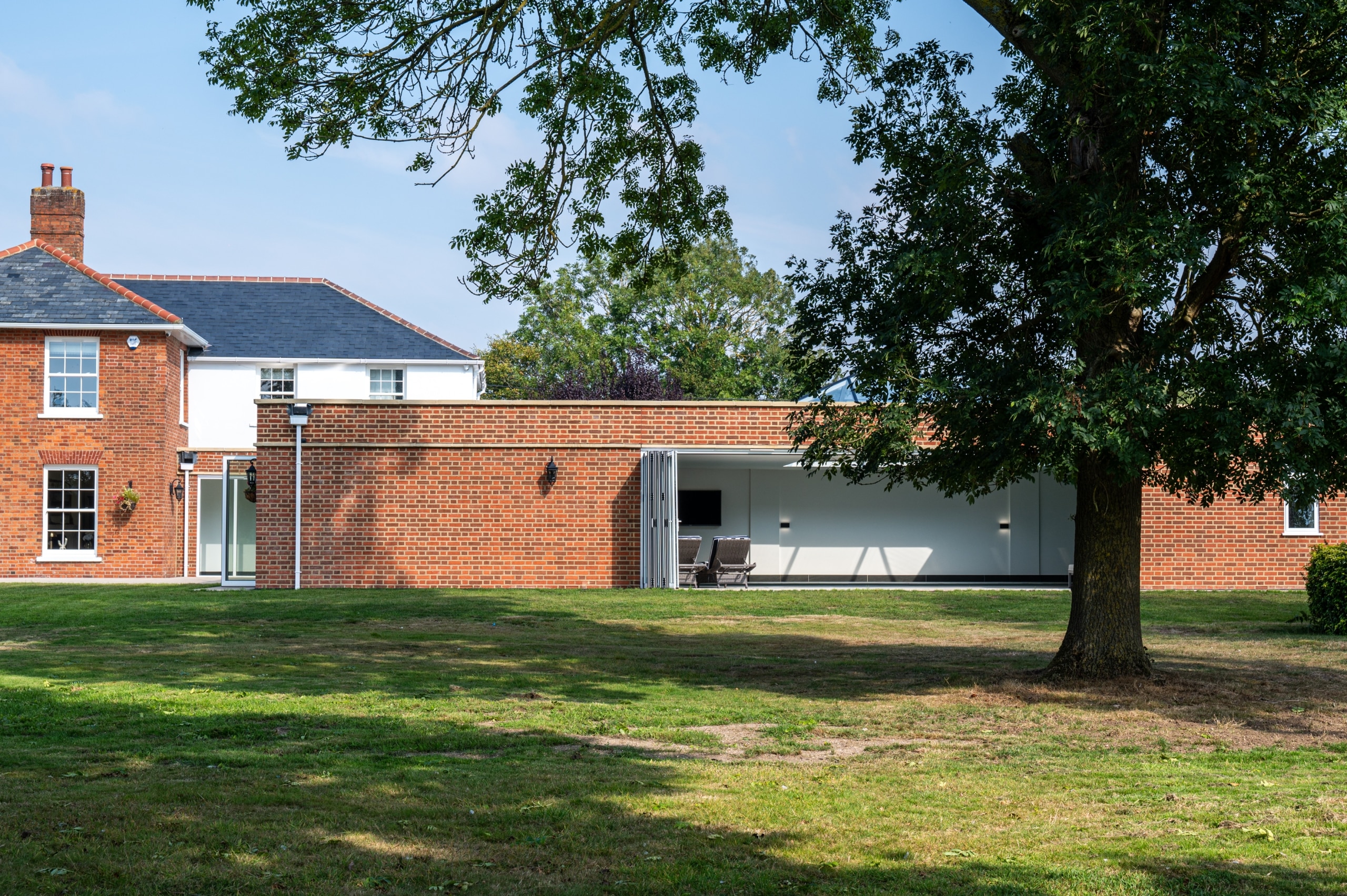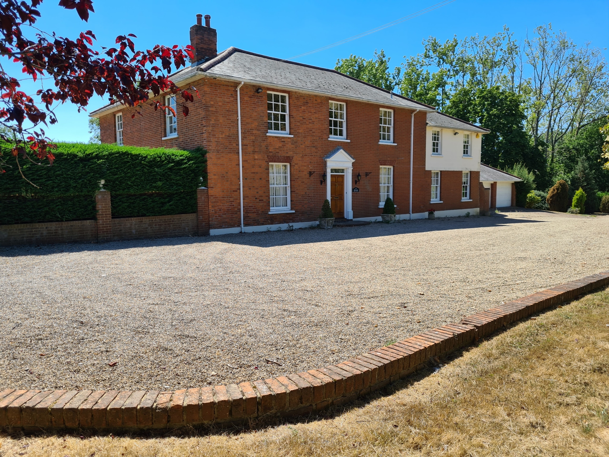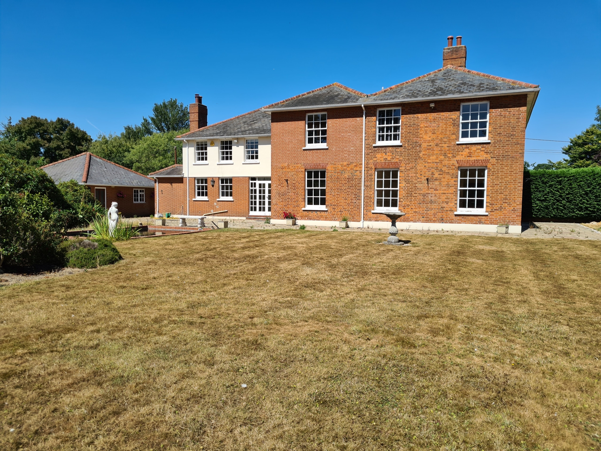 Our client purchased this beautiful detached, Georgian period property with a view to restore it to its former glory. The property was sympathetically renovated throughout, using traditional skirting boards, deep coving and a stunning, galleried, wooden staircase. The old Georgian bar, sliding sash windows were replaced with sympathetic period styled modern glazing with simple white frames and Georgian bar design. The single-storey rear extension gave our clients a huge open-plan, family living space, complete with traditional shaker Kitchen, large island and dining area. The addition of two glass lanterns and bifold doors create a light filled space which makes the most of the beautiful garden views and countryside setting. An indoor swimming pool was also part of the scheme and was cleverly incorporated into the design via a glass link from the main house. The complete enhancement was achieved with both single-storey and double-storey extensions and front and rear landscaping.