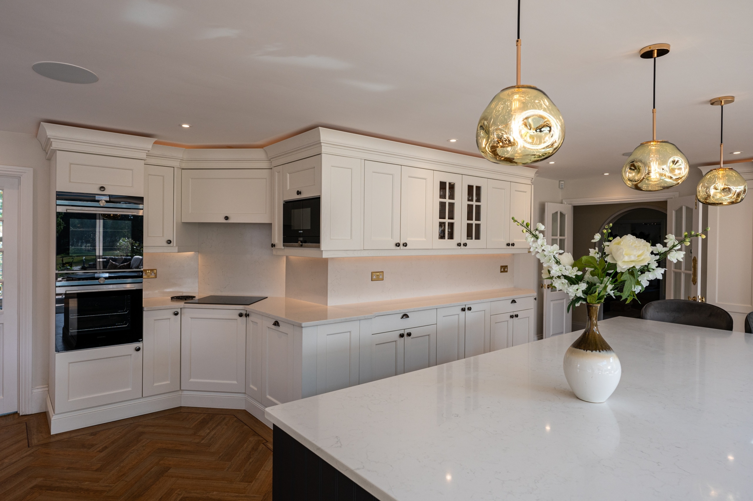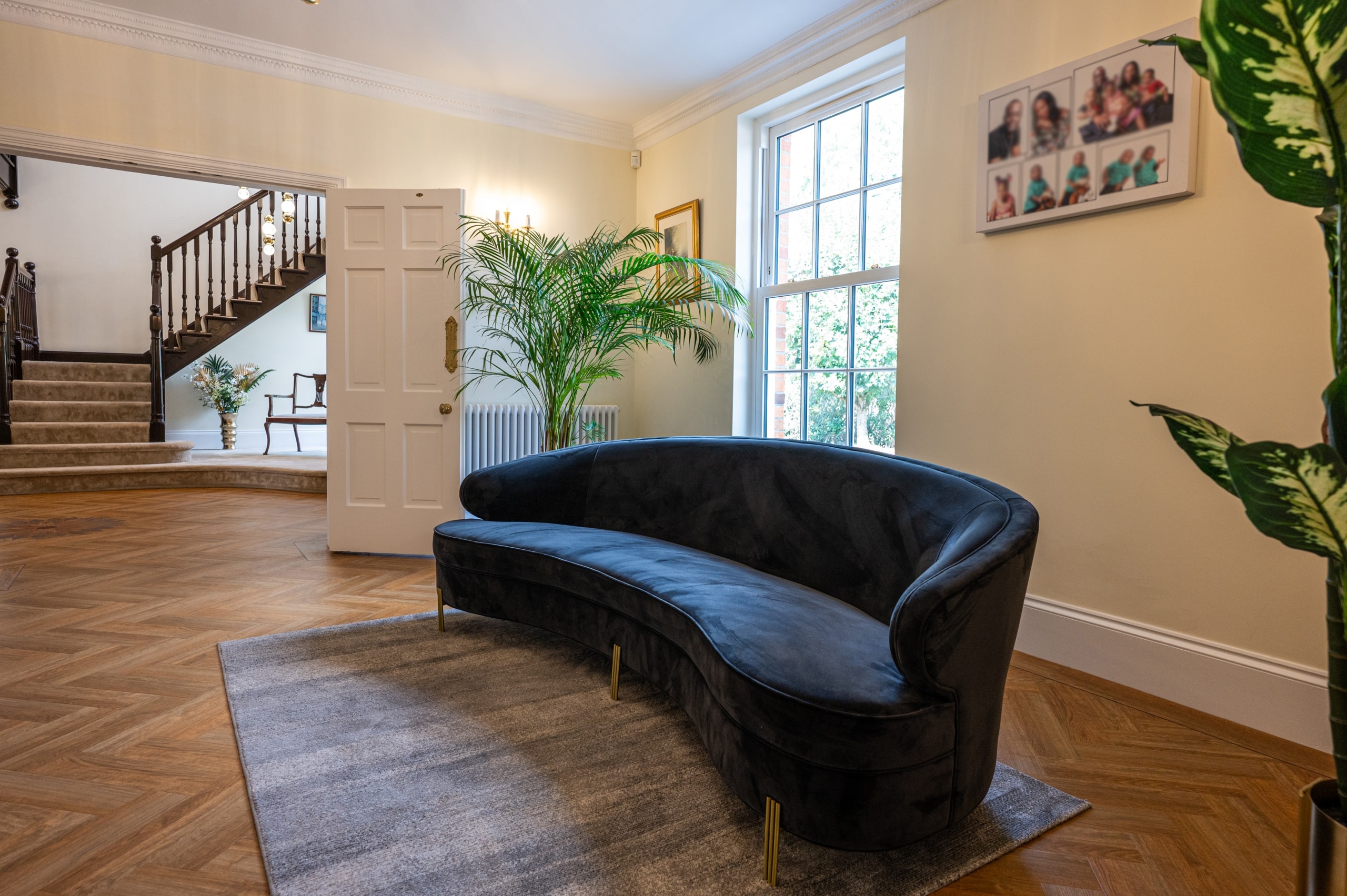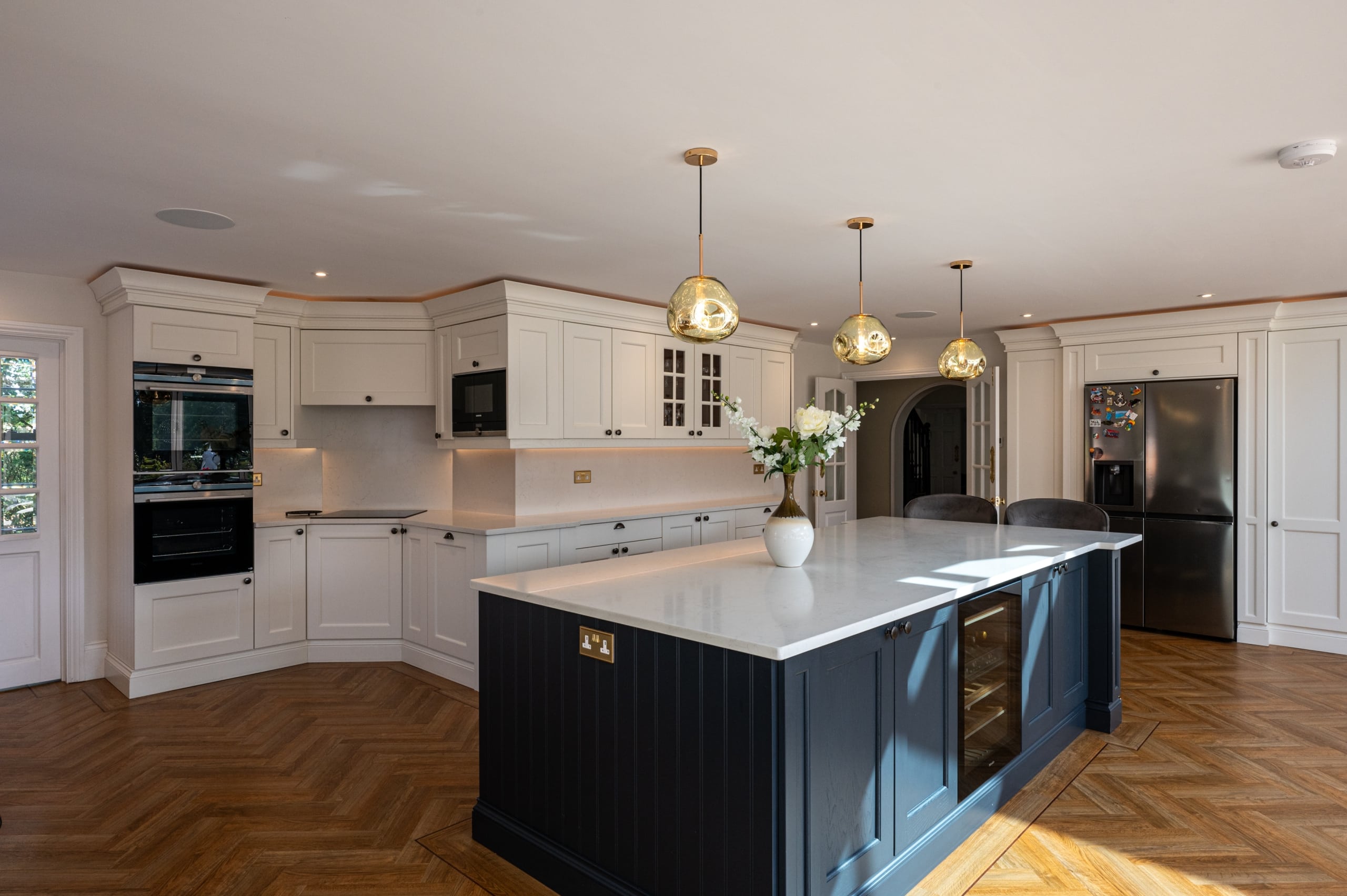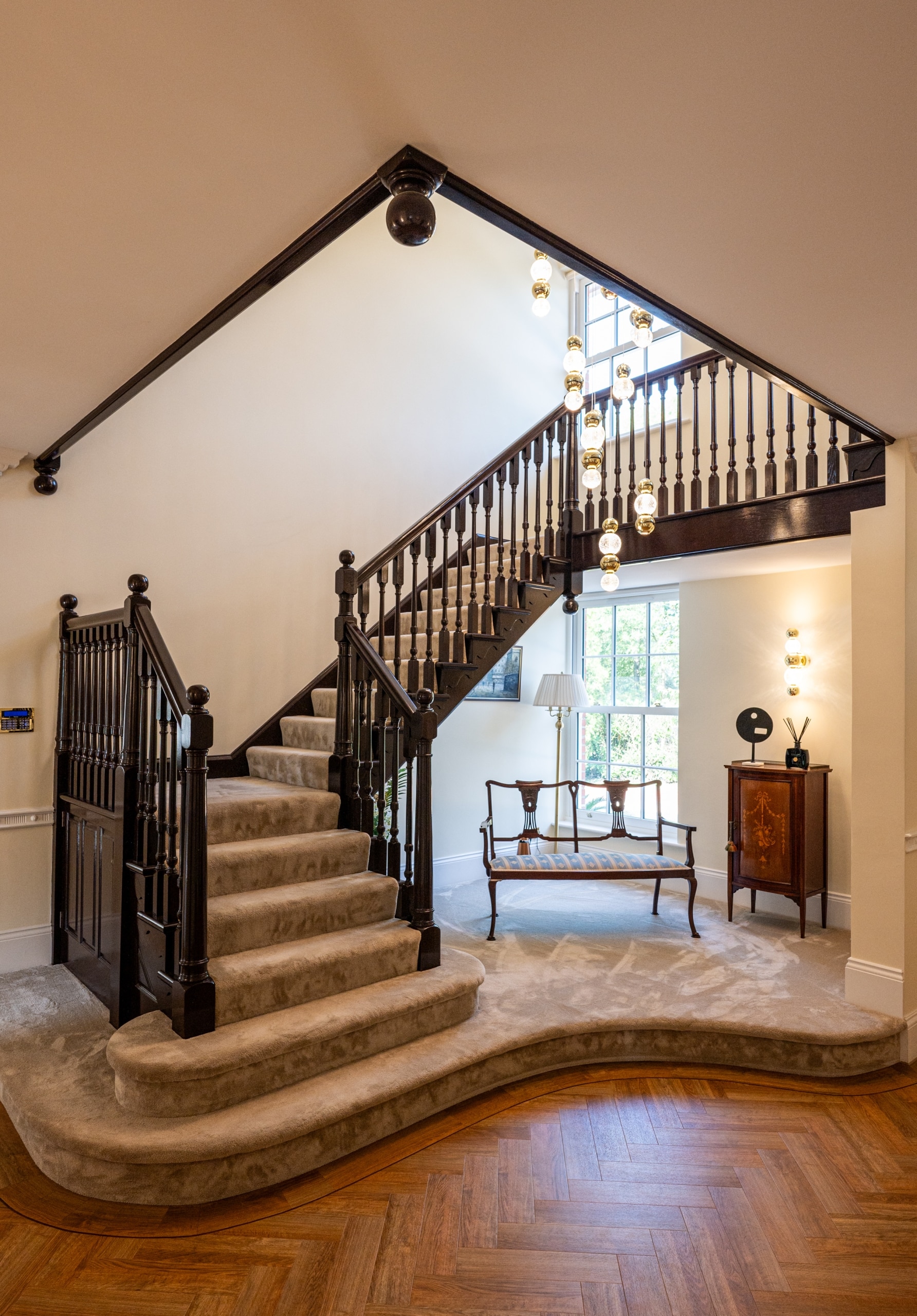 Our client purchased this beautiful detached, Georgian period property with a view to restore it to its former glory. The property was sympathetically renovated throughout, using traditional skirting boards, deep coving and a stunning, galleried, wooden staircase. The old Georgian bar, sliding sash windows were replaced with sympathetic period styled modern glazing with simple white frames and Georgian bar design. The single-storey rear extension gave our clients a huge open-plan, family living space, complete with traditional shaker Kitchen, large island and dining area. The addition of two glass lanterns and bifold doors create a light filled space which makes the most of the beautiful garden views and countryside setting. An indoor swimming pool was also part of the scheme and was cleverly incorporated into the design via a glass link from the main house. The complete enhancement was achieved with both single-storey and double-storey extensions and front and rear landscaping.