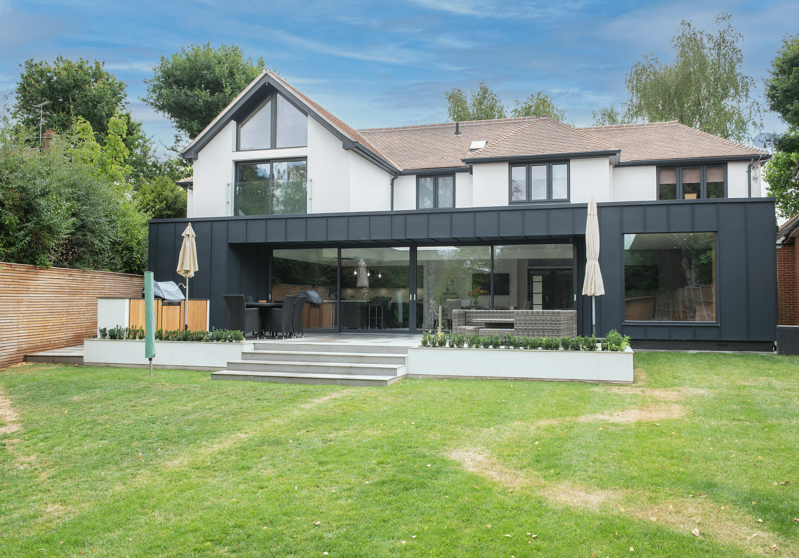 Our client’s wanted to completely transform the look of their detached family home to create a stunning modern property with curb side appeal. They particularly wanted to create more light in the rear of the property and incorporate a full width open plan living space. The front and rear of the property is now totally transformed with the families’ dreams being realised. The brief was met by completely reconfiguring the internal layout and completely altering the external shape of the building with the addition of a large double storey and single storey extension. The stunning single storey extension at the rear, clad in Zinc and incorporating huge floor to ceiling glass doors gave our clients an amazing open plan kitchen and living space, filled with much needed light. The architectural design and clever use of a mix of external finishes and materials created the striking modern external look our client’s desired.