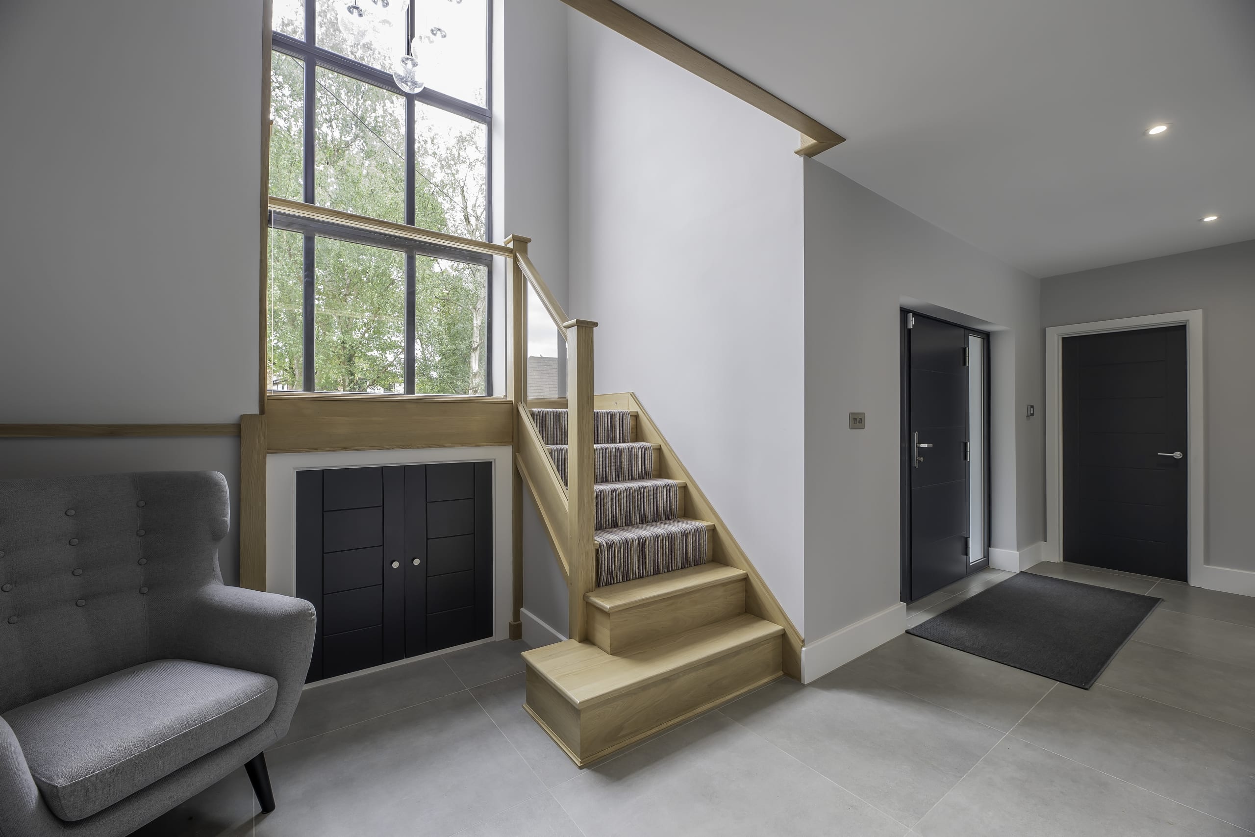 - Bespoke internal joinery including modern internal doors, skirting, architraves, and modern staircase with glass balustrade