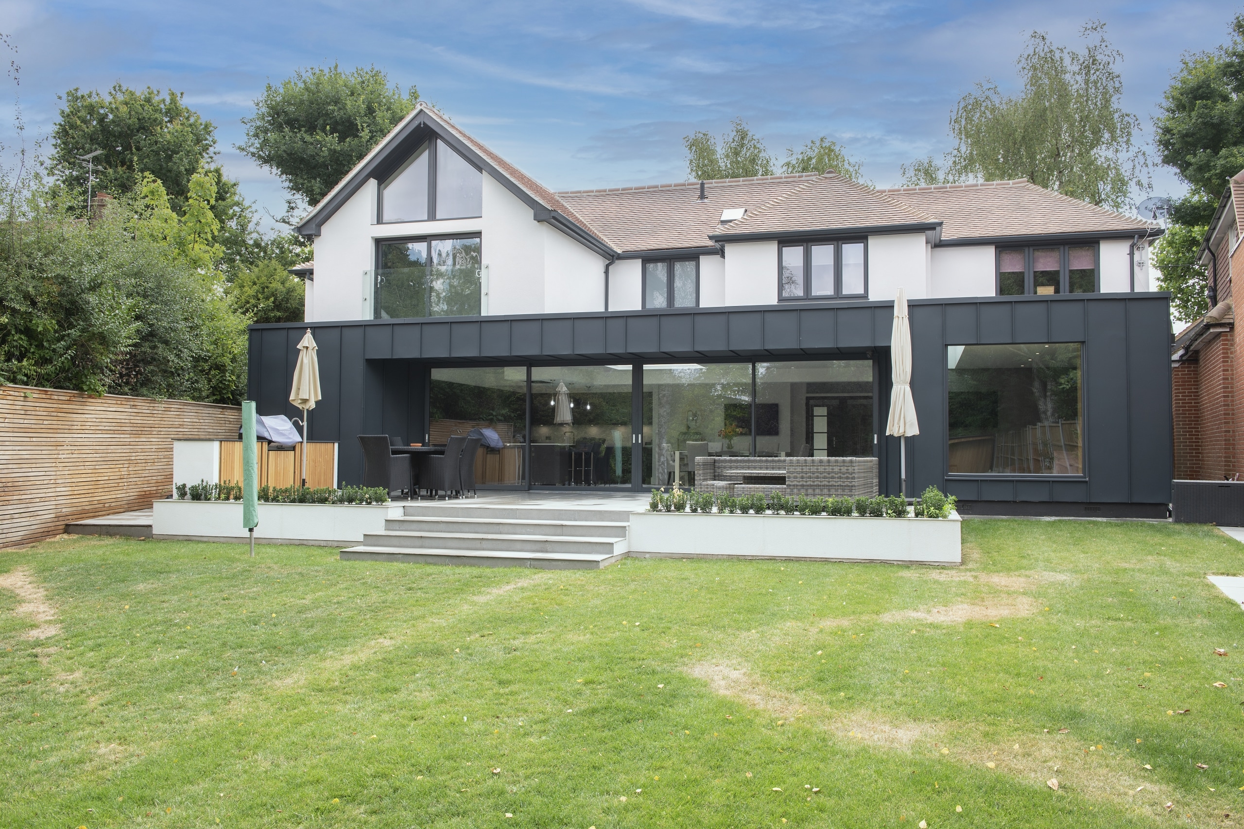 Our client’s wanted to completely transform the look of their detached family home to create a stunning modern property with curb side appeal. They particularly wanted to create more light in the rear of the property and incorporate a full width open plan living space. The front and rear of the property is now totally transformed with the families’ dreams being realised. The brief was met by completely reconfiguring the internal layout and completely altering the external shape of the building with the addition of a large double storey and single storey extension. The stunning single storey extension at the rear, clad in Zinc and incorporating huge floor to ceiling glass doors gave our clients an amazing open plan kitchen and living space, filled with much needed light. The architectural design and clever use of a mix of external finishes and materials created the striking modern external look our client’s desired.