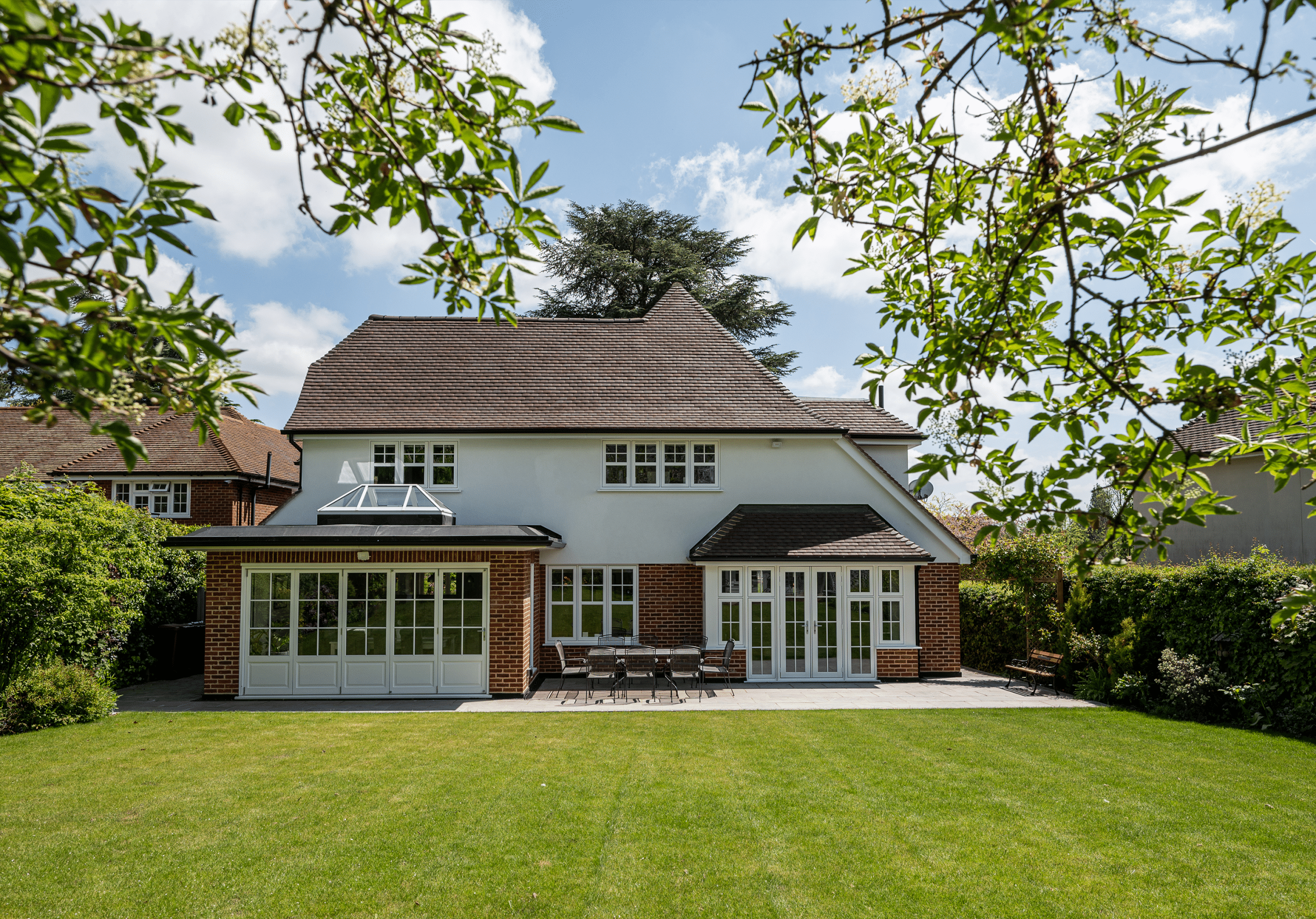 Our client purchased this detached property with a view to completely modernise it throughout. The 1970’s Hutton Mount modernisation project’s exterior was completely transformed using beautiful architecture and design and quality finishing. The old PVC glazing was replaced with a contemporary take on traditional Georgian window design with the addition of a beautiful orangery at the rear, complete with glass lantern and bespoke half-panelled bi-fold doors. The double and single-storey extensions provided much-needed space and filled the property with light and warmth. The cleverly designed rear of the property ensured a flow between spaces and gave our clients a light and bright entertaining, dining and family living space, complete with a traditional bespoke Shaker-style Kitchen and large island. Total renovation throughout coupled with a nod to traditional materials and introduction of modern pieces creates a perfect family home that is both functional and beautiful. The complete enhancement was achieved with considerable demolition and creation of both a single storey and double-storey extension.