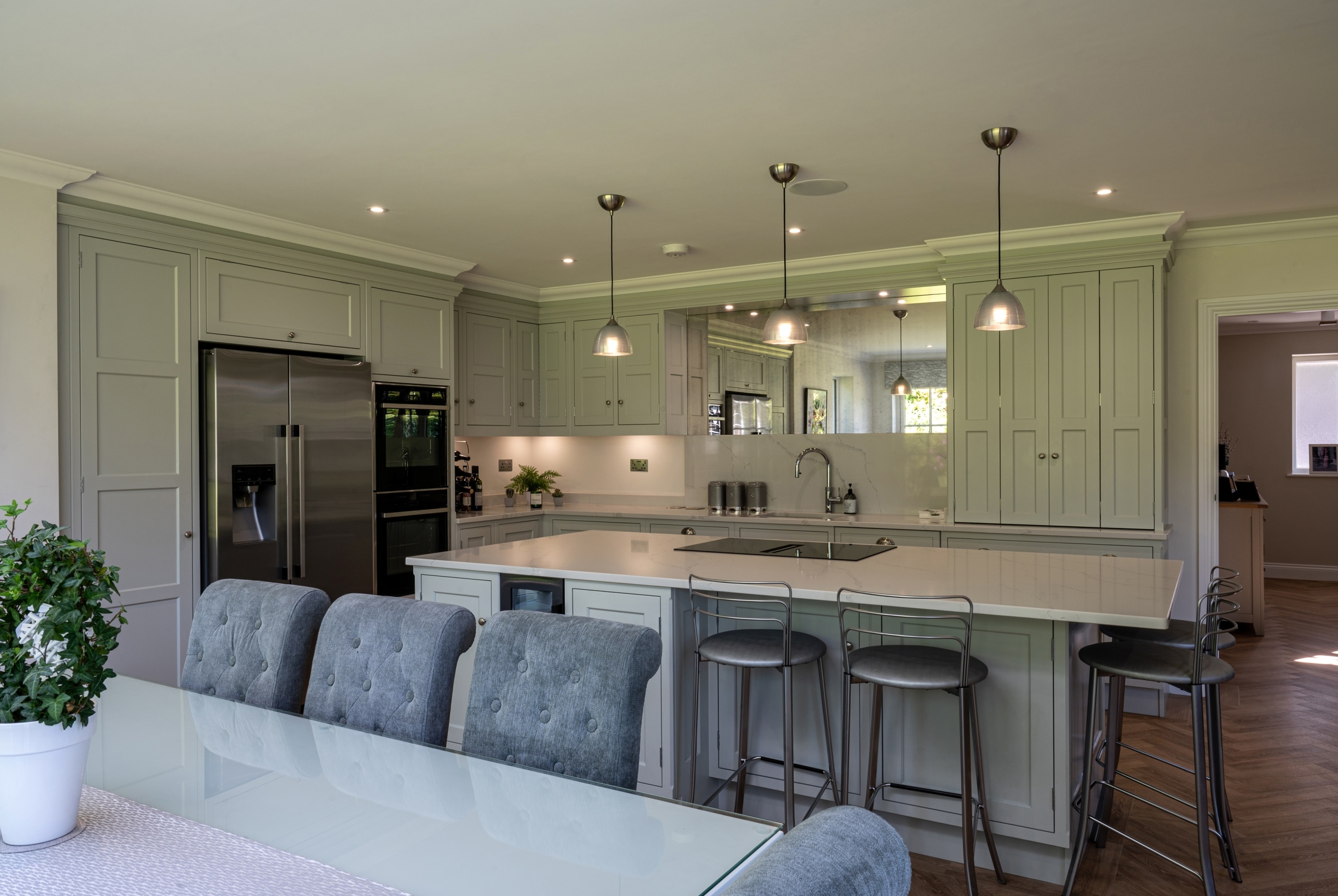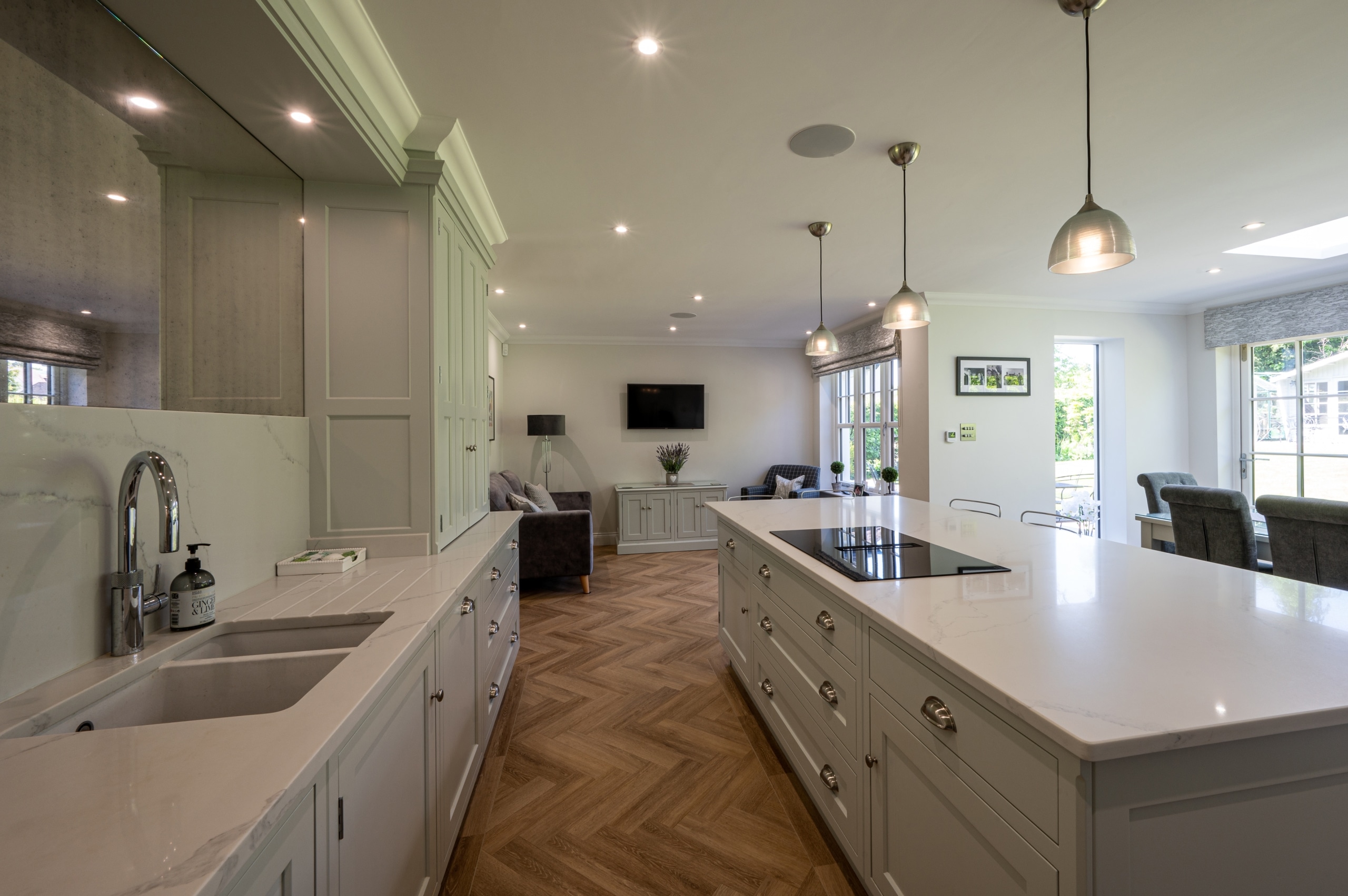 Our client purchased this detached property with a view to completely modernise it throughout. The 1970’s Hutton Mount modernisation project’s exterior was completely transformed using beautiful architecture and design and quality finishing. The old PVC glazing was replaced with a contemporary take on traditional Georgian window design with the addition of a beautiful orangery at the rear, complete with glass lantern and bespoke half-panelled bi-fold doors. The double and single-storey extensions provided much-needed space and filled the property with light and warmth. The cleverly designed rear of the property ensured a flow between spaces and gave our clients a light and bright entertaining, dining and family living space, complete with a traditional bespoke Shaker-style Kitchen and large island. Total renovation throughout coupled with a nod to traditional materials and introduction of modern pieces creates a perfect family home that is both functional and beautiful. The complete enhancement was achieved with considerable demolition and creation of both a single storey and double-storey extension.
