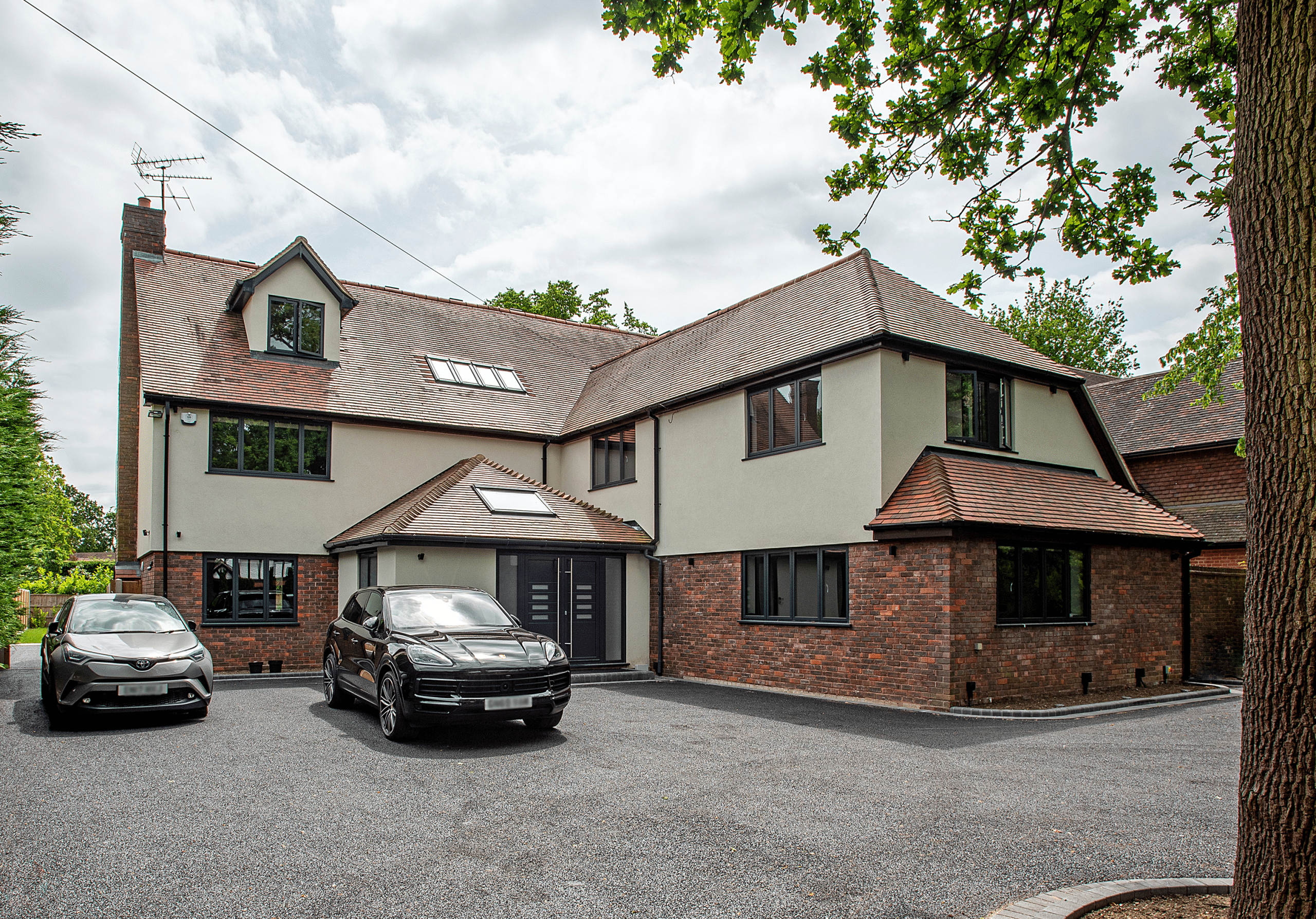 Our client’s purchased this detached property with a view to completely modernise it throughout. The dark tiled and red brick exterior was completely transformed in part using a light render finish. The old Mahogany, Georgian bar glazing was replaced with modern glazing with simple black frames. The single storey rear extension gave our clients a huge open plan, family living space, complete with modern, bespoke Kitchen and large island. The full width bifold doors combined with the large glazed lantern are a total triumph filling the space with light and garden views. Total renovation throughout coupled with the bold creation of a stunning floating staircase with glass balustrade, framed by a floor to ceiling internally tiled wall is a designer’s dream. The complete enhancement was achieved with both a single storey and double storey extension and loft conversion.
