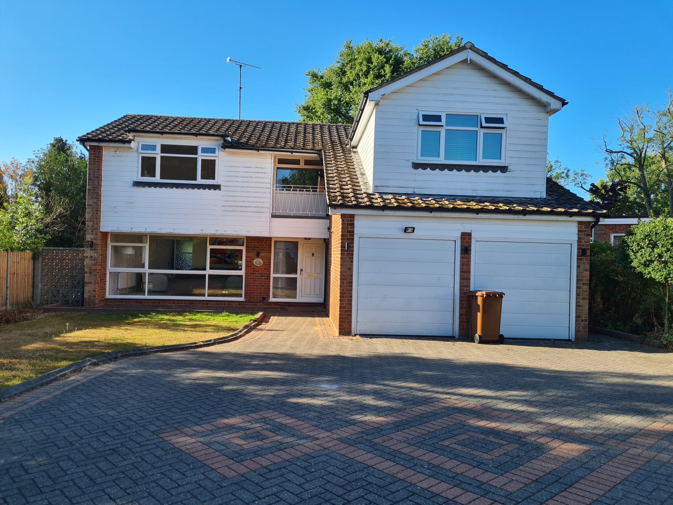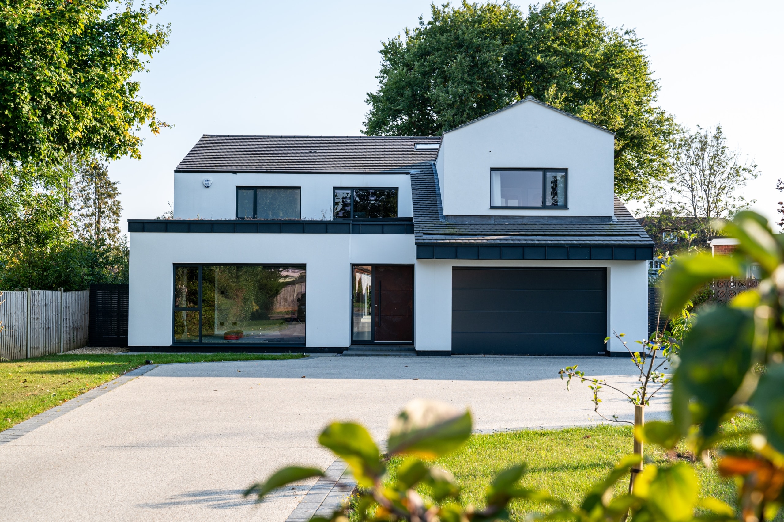 Our client purchased this detached 1970’s Chalet House with a view to totally transform it. Although the architecture at the front of the property had to retain some of the original features due to planning policy, the rear elevation was completely modernised, utilising an open plan design with a cantilever structure allowing the rear of the property to completely open onto the garden. The addition of partial metal Cedar coloured cladding to the rear adds depth and interest and really highlights the different angles of the modular design. The old windows were replaced with stunning aluminium casement/sliding windows with Grey frames and large panes to further complement the modern design. Our clients were also very keen to ensure their property was environmentally efficient, installing Solar Panels to supplement their energy usage and also having a Green (living) Roof to reduce their CO2 impact. The property was also completely covered on all sides including the roof with 160mm Celotex insulation. The single-storey rear extension gave our clients a huge open-plan, living space, complete with modern Kitchen, large island and Dining area. The addition of two sets of sliding doors is a total triumph filling the space with light and making the most of the beautiful garden views. Total renovation throughout coupled with bold interior and exterior design choices in every aspect of the project creates a stunning family home. The complete enhancement was achieved with front single-storey and rear single-storey extension.